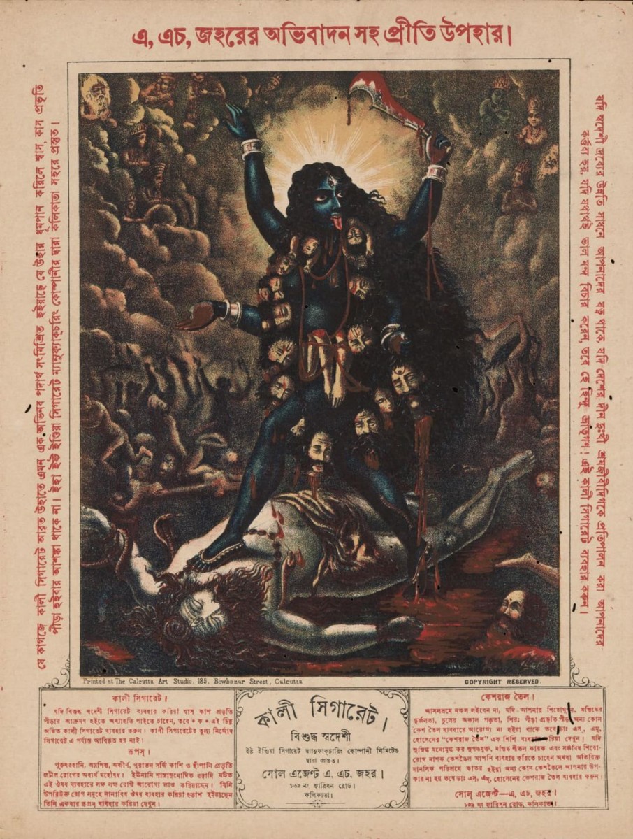 The image that you can see below is of a colour lithograph, a print advertisement, of Kali cigarettes that were specially popular in Calcutta and Bengal.This advertisement dates from the late nineteenth century (1885-90). The print was published by the Calcutta Art Studio, of 185 Bowbazar Street, Calcutta. A copy of the print is in the collection of the British Museum, London.