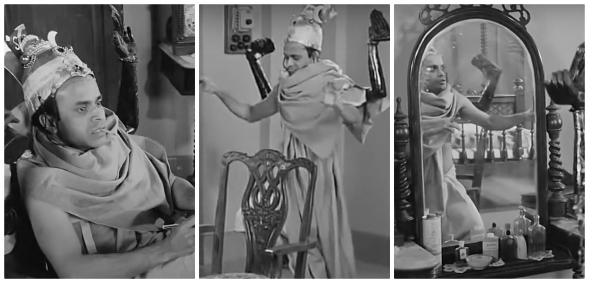 Manimekalai’s Kali-persona reminds us of other moments where the divine incarnates, suddenly and unexpectedly, in the form of a bahurupee (a shape-shifting polymorph) in Indian cinema. No, not in exemplars of the ‘mythological’ film genre, but in films that speak to our mundane here and now, interrupting the flow of the cinematic time of ordinariness with electrifying epiphanies. From the emaciated, ‘Bahurupee’ Kali in an abandoned Second World War airfield who appears to startle a boy and a girl in Ritwik Ghatak’s Subarnarekha, to the amazingly whimsical, androgynous, ardhanarishwara, corseted Rabi Ghosh, lounging on a chair, and yes, smoking a beedi, prior to getting up and casually practicing languid Natajara dance moves in front of a mirror in Satyajit Ray’s brilliantly comic send up of spiritual charlatanry in Mahapurush; the cinematic avatar of the shape-shifting bahurupee has had a distinguished lineage. Manimekalai’s embodiment of this figure places her squarely within many traditions – cinematic, iconographic, performative, transgressive and even, we might say, devotional.