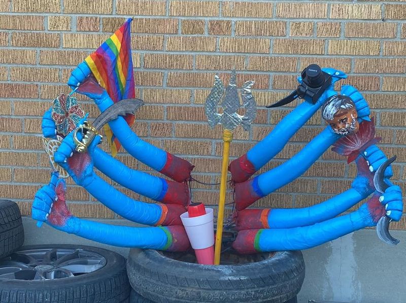 The body of the performer playing the goddess is garlanded with flowers, and studded, as it should be, with objects that look like human skulls. She is fitted with an accessory that signifies an extended tongue, and attaches herself to several prosthetic arms that hold, along with a trident, a sharp curving blade, and the customary decapitated male head, a camera (to witness), a megaphone (to rally) and the rainbow of an LGBTQ flag (to signal her pride, her compassion, her inclusiveness). She is a media and tech savvy, 21st century, vernacularly cosmopolitan divinity made of very queer flesh. Some would say, (and not without reason) that she looks, ‘divine’. So far, the only objections to the image have been triggered by the presence of the cigarette. Luckily, no one has as yet latched on to the presence of the LGBTQ flag in association with Kali. Were that to happen, we would know that the forces of global Hindutva were approaching the likelihood of hitting an all-time homophobic low.
