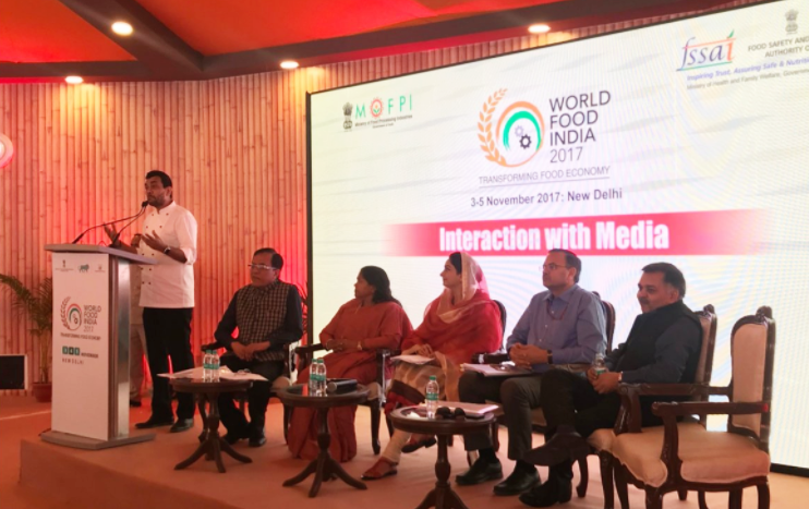 Chef Sanjeev Kapoor addresses the media at the World Food India curtain raiser event in New Delhi on November 1, with Union minister of food processing industries Harsimrat Kaur Badal (middle). Credit: Twitter/World Food India