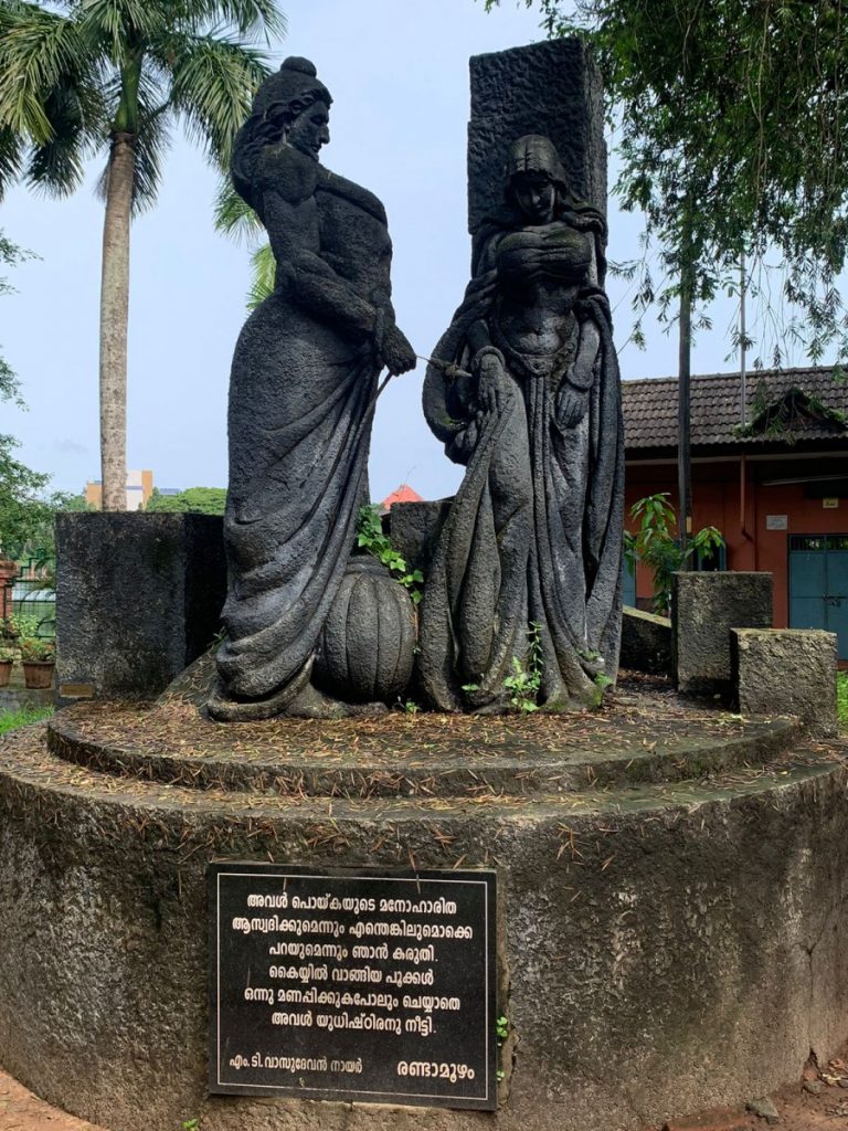 “The sculpture depicts Draupadi, also Bhima’s wife, but she barely looks at the flowers Bhima has brought and hands them over to Yudhishthira, her favourite husband. Draupadi is always seen as partial to Yudhishthira and Arjuna … MT’s book is a radical re-writing from the point of view of Bhima, and we realise that he has been given a raw deal in the epic. The book was to be made into a film starring superstar Mohanlal, but Nair pulled back the script after a long legal battle.”