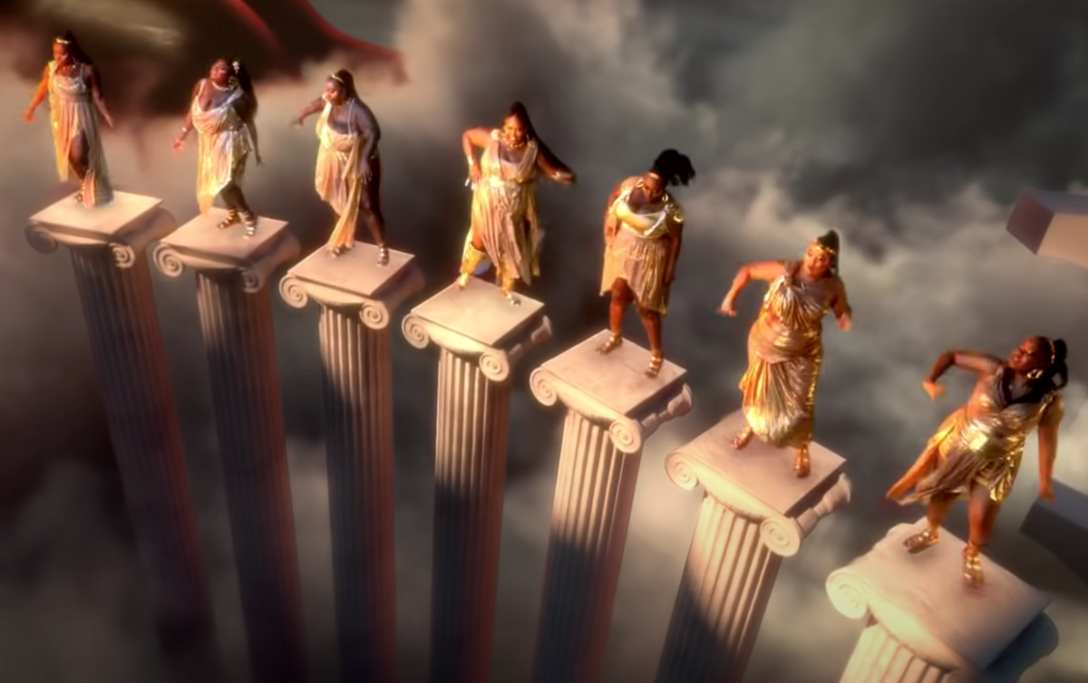 Lizzo and her dancers perform their choreography atop classical columns, positioning themselves as the muses – an allusion, perhaps, to the black muses in Disney’s animated film Hercules.