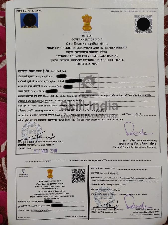 Here is an example of the certificates Maruti Suzuki gives the trainees.