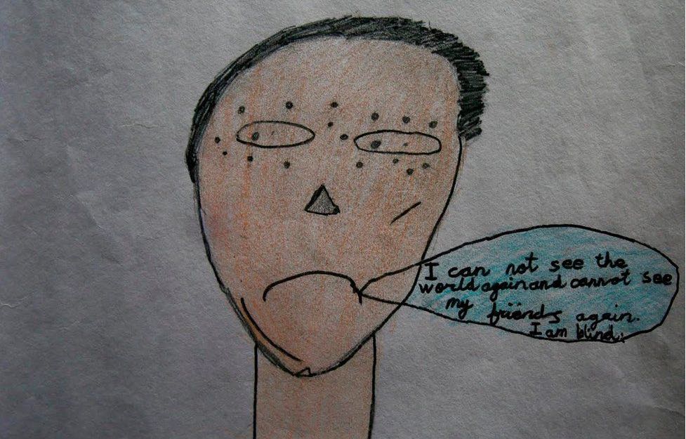 "They draw red skies, red mountains, lakes, flowers and houses on fire. They draw guns and tanks, fire-fights and people dying on the street."