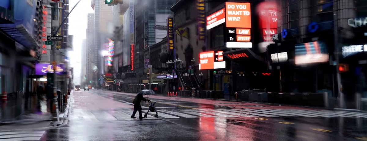 A person with a walker crosses 42nd Street in a mostly deserted Times Square following the outbreak of Coronavirus disease (COVID-19), in the Manhattan borough of New York City, New York, US, March 23, 2020. Photo: Reuters/Carlo Allegri