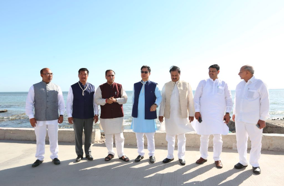 Vijay Rupani with Union minister of state for home affairs Kiren Rijiju, chief minister Pema Khandu and CM of Manipur N. Biren Singh at Porbandar. Credit: Twitter