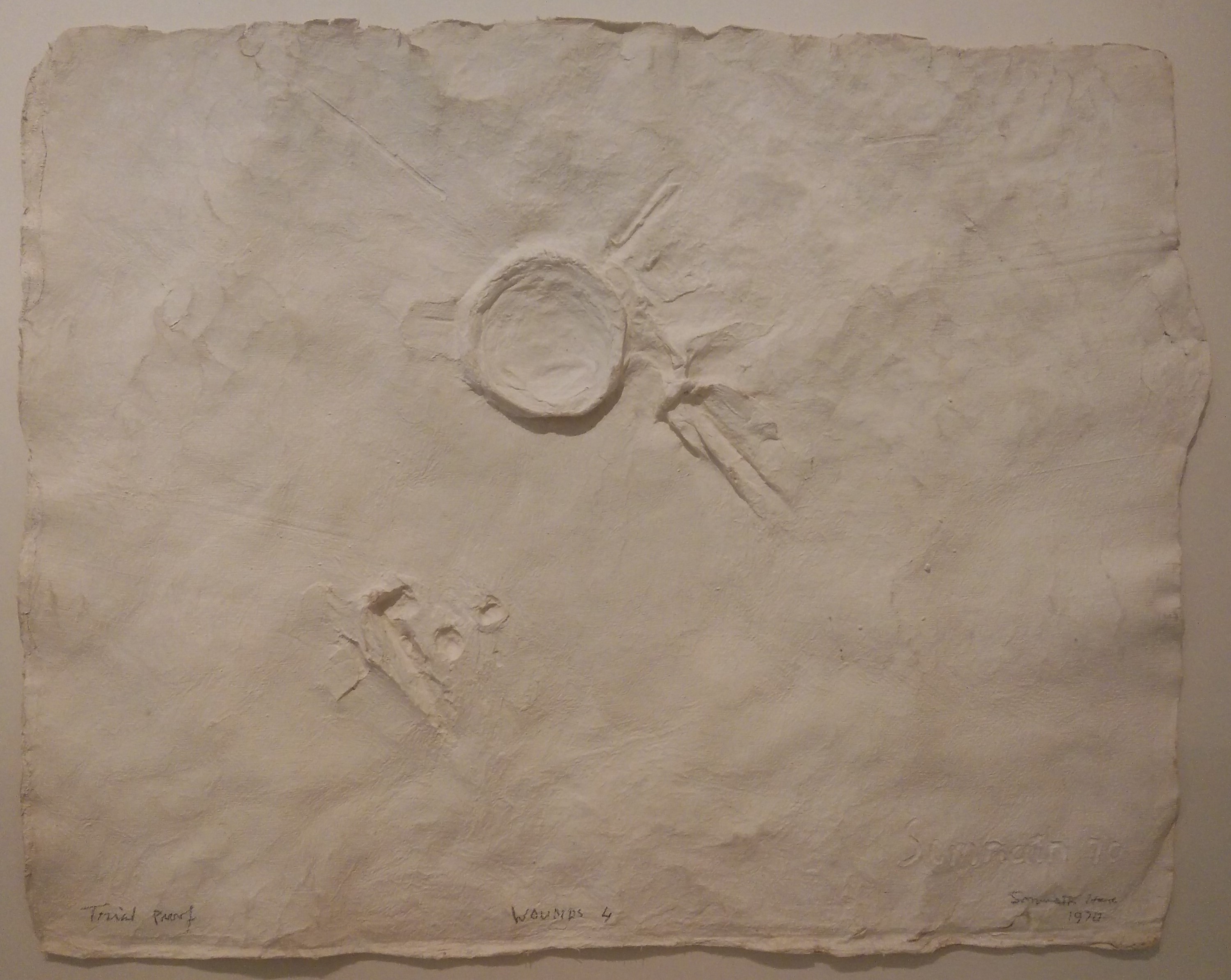 Somnath Hore translated the violence into the very architecture of the paper. Pranabanjan Ray writes of these works, “the shapes and the contortions have dynamism of an organic kind, evoking thereby the associations of germination, birth, decay and death.” Ray observes that these works are more tactile than visual, conveying a sensation of “flesh pierced by knives, spiked by bayonets, battered by heavy sledge-hammers, ferreted by shrapnels and spoilt by unattended gangrene oozing blood and pus.”