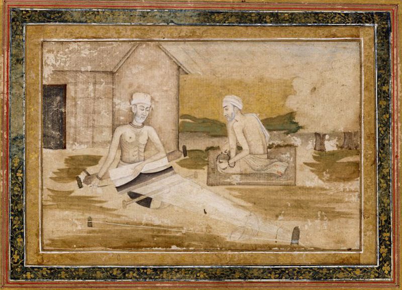 So, I turn to the Saakhis of Kabir again and again. Outside of myths, little is known about the man, except that he was born in Kashi, adopted and brought up by a family of Muslim weavers, and remained a weaver of words and fabrics until his death in 1518. He was not literate and his poetry has come down to us mostly by word of mouth. It was first codified only later. There is this 1625 tempera water colour painting from the collection at the National Museum by an unknown artist. It shows Kabir sitting at his loom weaving and meditating quietly in the company of fellow Varanasi poet Raidas, a cobbler.
