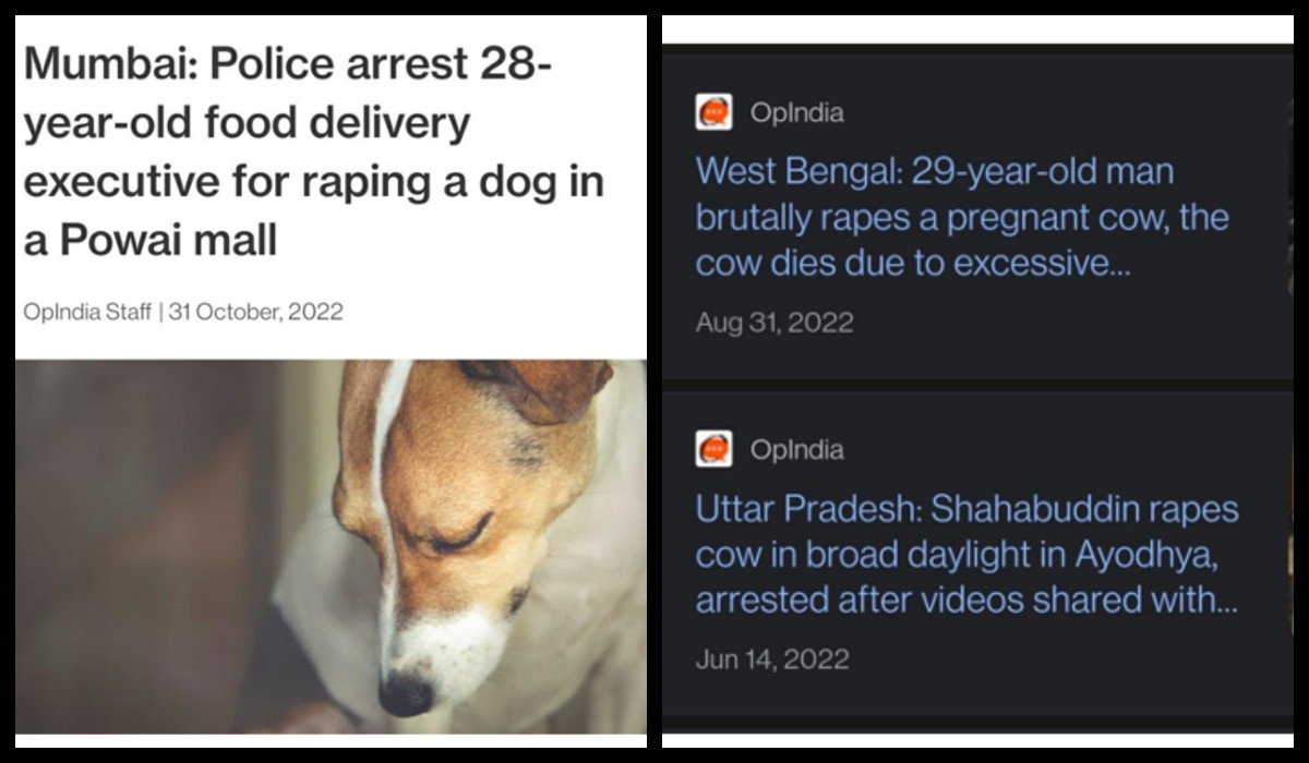 Once in a while, an incident of cruelty and sexual violence against animals in which the accused are Muslim men goes viral on social media. A simple Google search will show you that such crimes have nothing to do with the religion of the accused. Take the below mentioned screenshots from the right-wing propaganda website OpIndia as an example. In the first headline, they have not used the names of the accused involved in unnatural sex with cattle and dogs but in the second headline, they have named the accused.