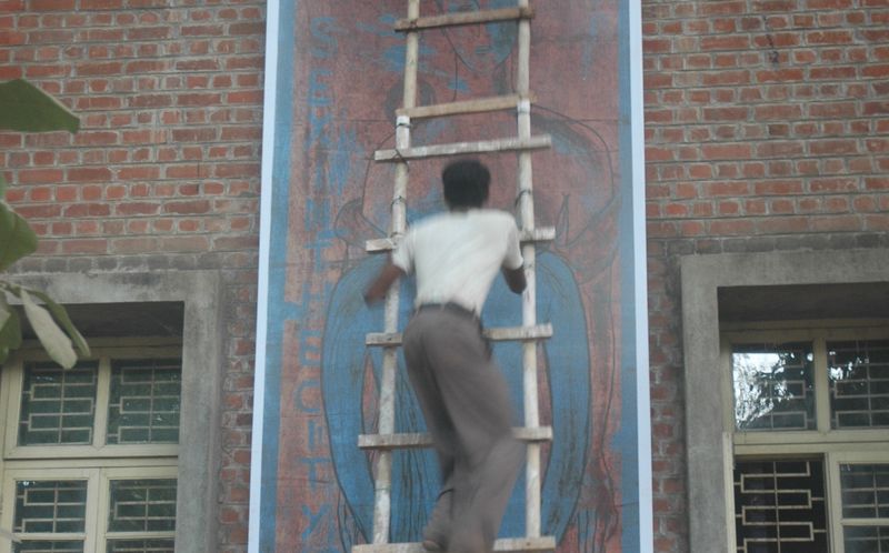 Government officials bringing down Chandramohan's art at the Faculty of Fine Arts, Vadodara, May 11, 2007. Image courtesy: Students of the Faculty of Fine Arts. Source: Akansha Rastogi and B.V. Suresh