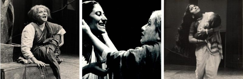 Vijaya Mehta's Nagamandala (1991), Left: Bhakti Barve as Kurudavva; Centre: Rani and Kurudavva; Right: Sukanya Kulkarni as Rani. Courtesy NCPA Mumbai.
