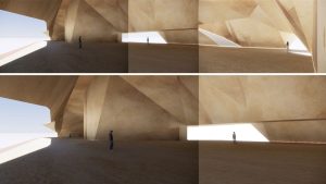 Having designed notable exhibitions such as the Golden Eye 1985, the Basic Needs Pavilion at Hannover 2000, the Silk Route Festival in Washington 2002, among others, the firm does something truly unique in an international setting. They took the design of the structure into an entirely new experimental realm: an AI generated wholly experimental building that – at the end of the exhibition – would degrade naturally into the site on which it was built. An organic architecture, first seeding, then growing, and eventually disappearing.