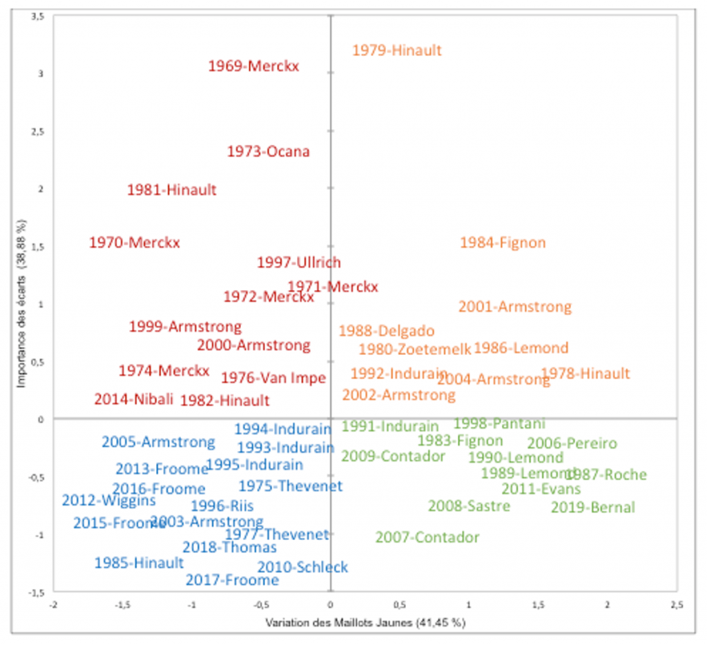 An analysis allows us to position and rank the 51 Tours de France since 1969 as shown in the following diagram. (Note that while the US rider Lance Armstrong’s seven victories were withdrawn due to doping, the data has been retained for statistical analysis.)