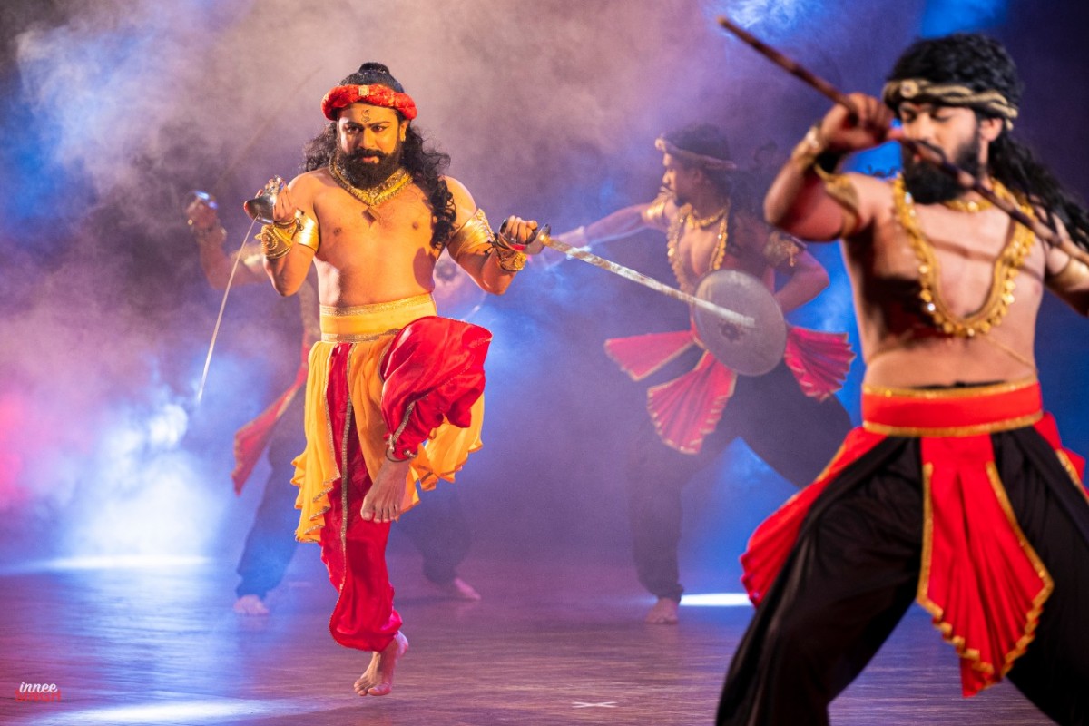 The nearly 60-person troupe includes more than 40 artistes trained in Bharatanatyam, Kathak, martial arts and the 108 key karanas from the Natyashastra a well as contemporary dance and a technical team of around 20, trained in animations, costume, make up, lighting, magic tricks and sound design.