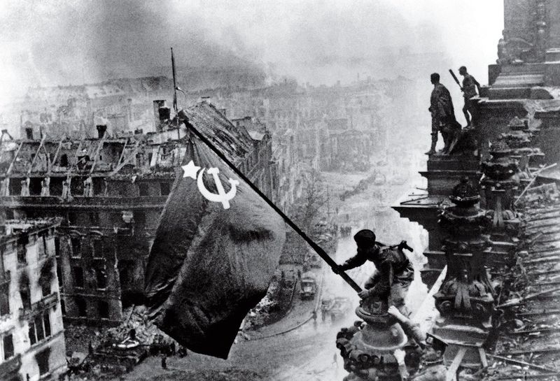 The same evening, Viktor Temin, one of Russia’s leading war photographers, persuaded Marshal Zhukov to let him photograph the Reichstag from the air. As he flew towards the building he saw, and photographed, a Red Army soldier placing the Red Flag on top of one of the Reichstag’s balustrades. He then flew on, without permission, to Moscow. On the following morning, May 1, Pravda carried that dramatic picture on its front page. Russia had managed to crush Nazi Germany.