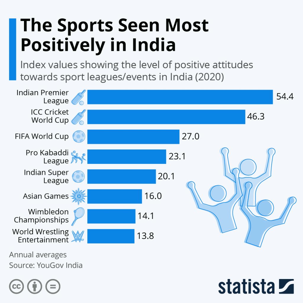 The results of an ongoing survey and index published by YouGov India show that Indians think most positively about cricket, soccer and also Indian contact team sport Kabaddi. Positive attitudes towards cricket registered highest, with the Indian Premier League and the ICC Cricket World Cup in the lead of the survey. Excitement about the soccer World Cup came next, followed by the Pro Kabaddi League with 23 out of 100 possible index points. Indian Super League soccer, the Asian Games, Wimbledon and Wrestling round off the top 8.