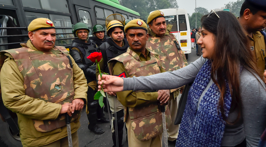A protestor offers a rose to police personnel during a demonstration against the Citizenship (Amendment) Act, at Mandi House, in New Delhi. Photo: PTI