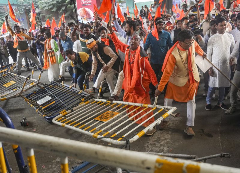 In Kolkata, a large group of protesters waving saffron flags sought to proceed towards the Bangladesh Deputy High Commission. The march, titled ‘Hindu Hunkar Padayatra (Hindu roar foot rally)’, was organised under the banner of the ‘Bongiyo Hindu Jagaran’ and began from the Sealdah area.