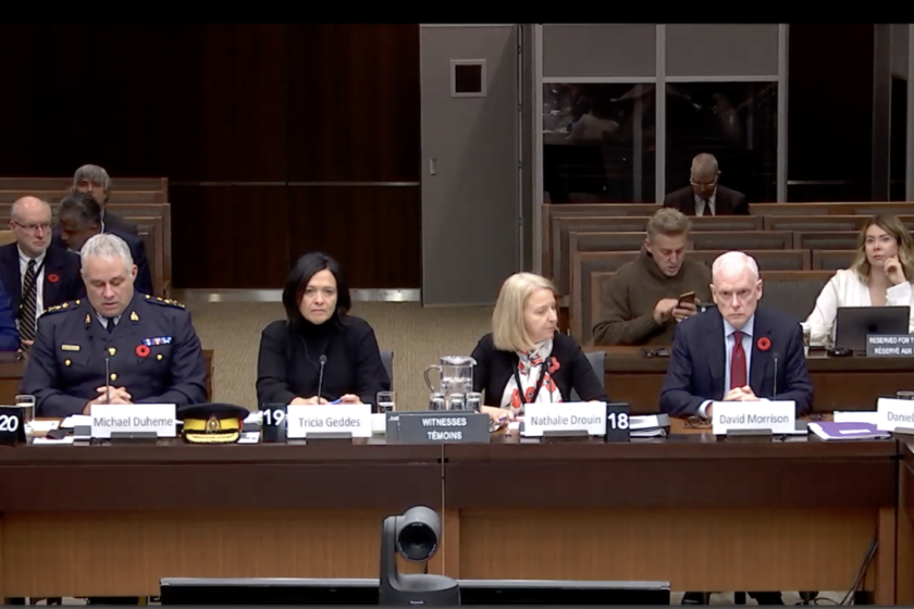 RCMP commissioner Michael Duheme (front, first from left), Tricia Geddes (associate deputy minister of public safety), Drouin (third) and Morrison (fourth) at the hearing. Photo: Screenshot from video of hearing.