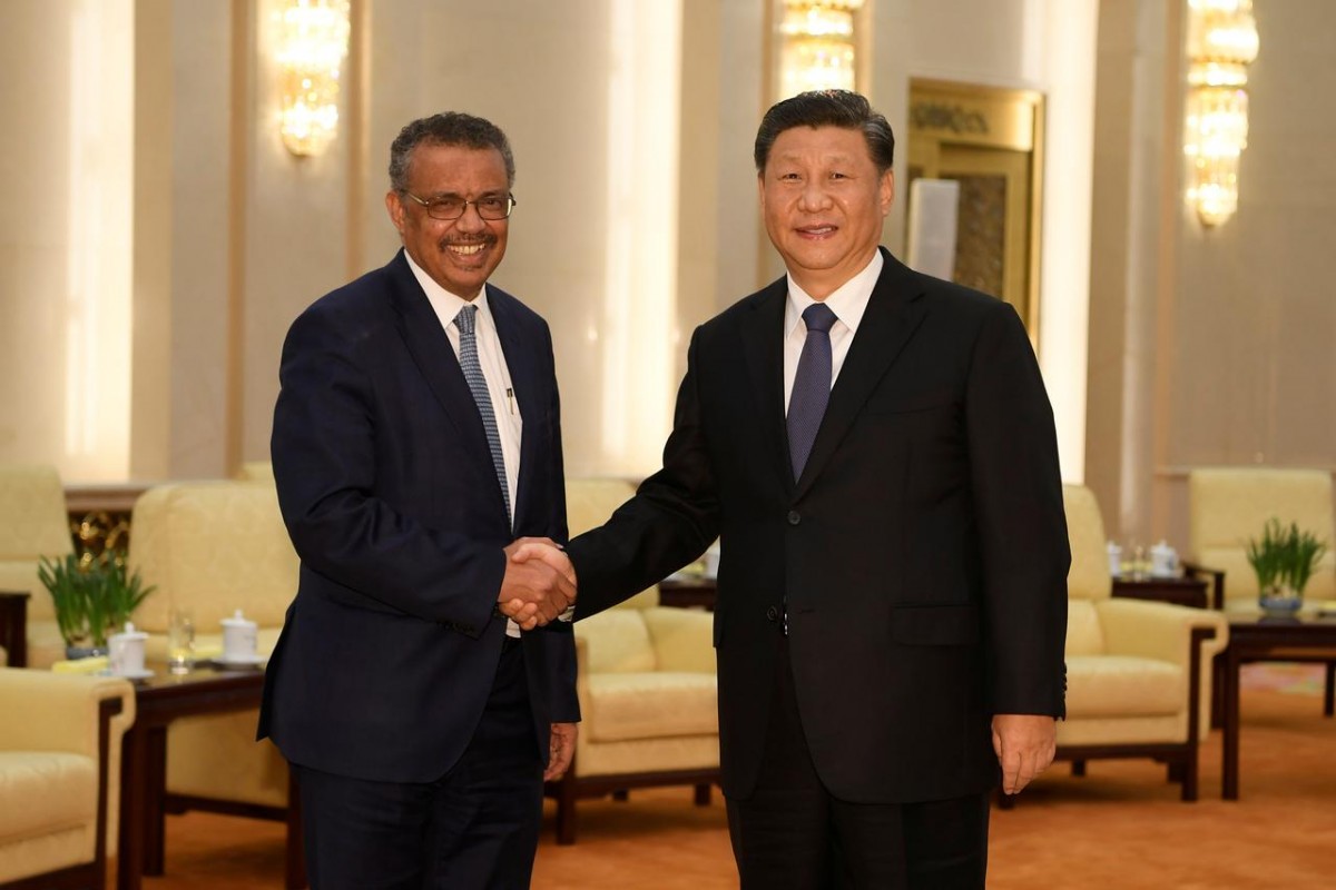 Tedros Adhanom, director general of the World Health Organization, shakes hands with Chinese President Xi jinping before a meeting at the Great Hall of the People in Beijing, China, January 28, 2020. Photo: Naohiko Hatta/Pool via Reuters