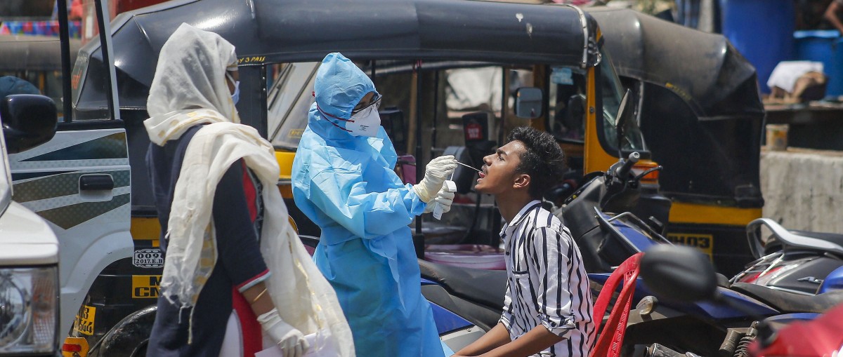 A medic takes samples for a swab test at Kurla area, identified as a containment zone, during the nationwide lockdown to curb the spread of coronavirus, in Mumbai, Saturday, April 11, 2020. Photo: PTI