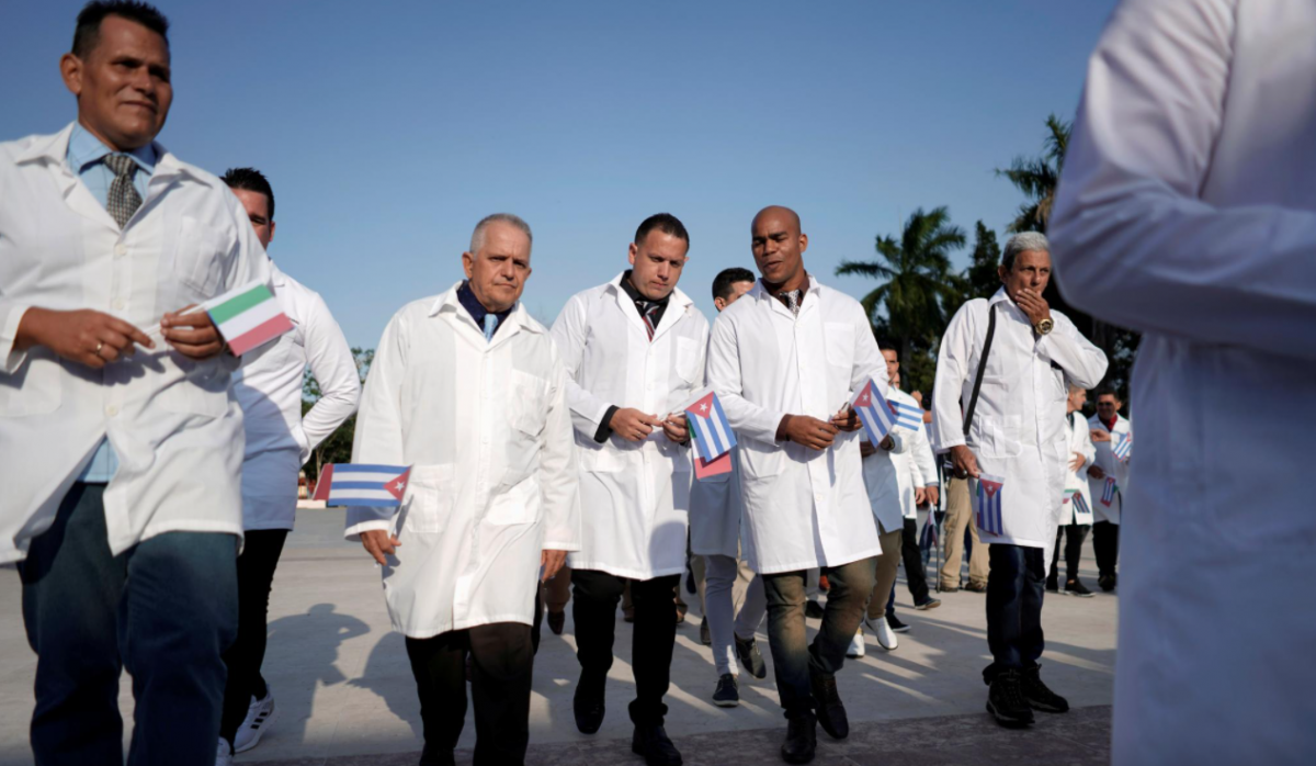 Cuban doctors take part in a farewell ceremony before departing to Italy to assist, amid concerns about the spread of the coronavirus disease (COVID-19) outbreak, in Havana, Cuba, March 21, 2020. REUTERS/Alexandre Meneghini/File Photo