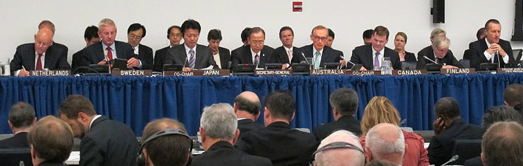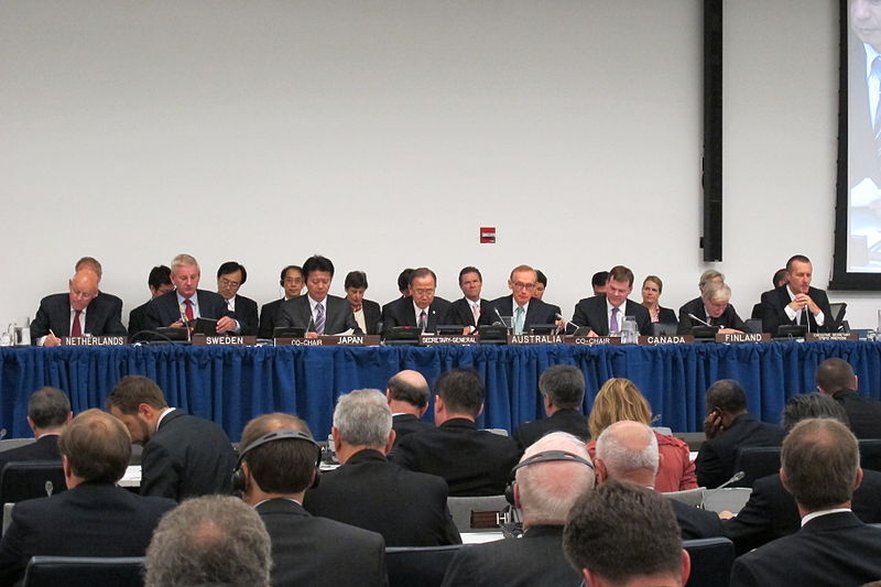 Chair of the Sixth Ministerial Meeting on the Comprehensive Nuclear-Test-Ban Treaty (CTBT) in New York, 27 September, 2012. From left to right, Dutch Foreign Minster, Uri Rosenthal; Swedish Foreign Minister, Carl Bildt; Japanese Foreign Minister, Koichiro Gemba; Secretary-General of the United Nations, Ban Ki-moon; Australian Foreign Minister, Bob Carr; Canadian Foreign Minster, John Baird; Finnish Foreign Minister, Erkki Tuomioja; Executive Secretary of the CTBTO, Tibor Tóth. Credit: CTBTO via Wikimedia Commons