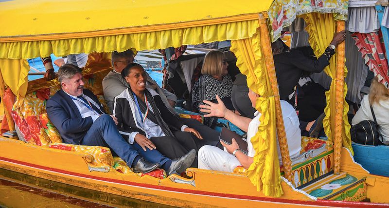 Members of the European Union parliamentary delegation click pictures as they board a shikara ride at Dal Lake in Srinagar, on October 29. Photo: PTI
