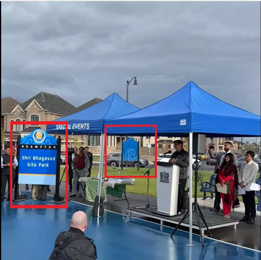 The Indian High Commission in Ottawa tweeted a collage of two photos – one of a signboard with the words Shri Bhagavad Gita Park on it and another a blank signboard with only an outline of a rose on it and claimed that there was "hate crime" at the park in Brampton.