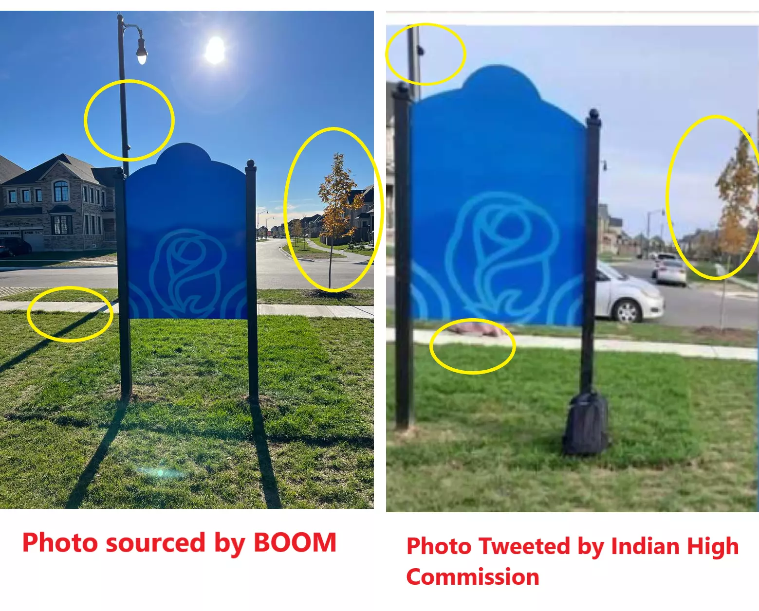It is important to point out that the images tweeted by the Indian High Commission are not of the same signboard. This is established by looking at the surface on where the board stands. While it is seen on a blue surface in one of the images, the signboard is seen on a grass lawn in the other image.