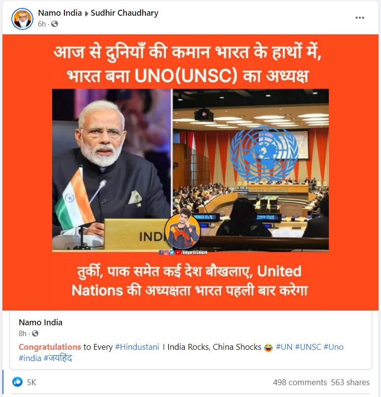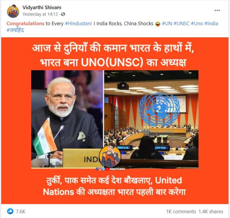 Facebook page ‘Namo India‘ recently posted a graphic that read, “From today onwards the command of the world is in the hands of India. India will take over the Presidency of UNO (UNSC). Several countries including Turkey, Pakistan were furious. India will preside over the United Nations for the first time.”