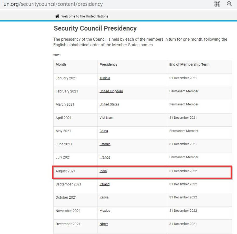 According to the official UN website, chairmanship of the Security Council is given to each of the members for a month. India will hold the Security Council Presidency for the month of August. Council members are appointed in alphabetical order. As seen in the image below, India’s membership will end on December 31, 2022. India is a member of the council during the present term (2021-2022).