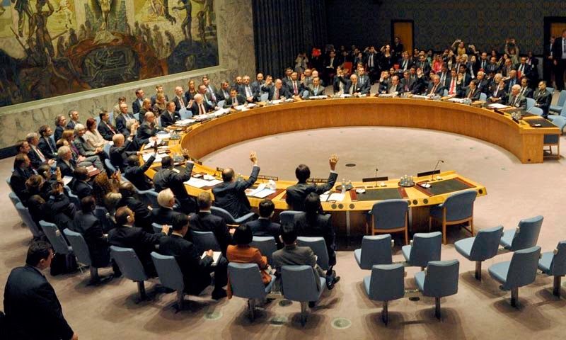 Members of the United Nations Security Council raise their hands as they vote unanimously to approve a resolution eradicating Syria's chemical arsenal during a Security Council meeting during the 68th United Nations General Assembly in New York on September 27, 2013. Credit: Reuters/Keith Bedford