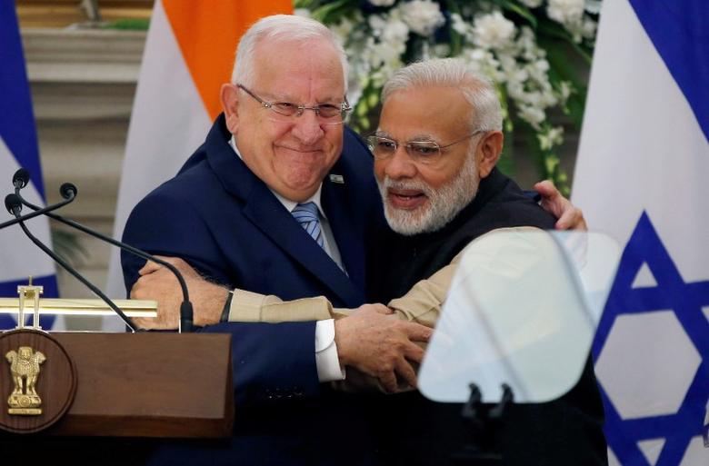 Israeli President Reuven Rivlin (L) and India's Prime Minister Narendra Modi hug each other after reading their joint statement at Hyderabad House in New Delhi, India, November 15, 2016. Photo: Reuters/Adnan Abidi/File Photo