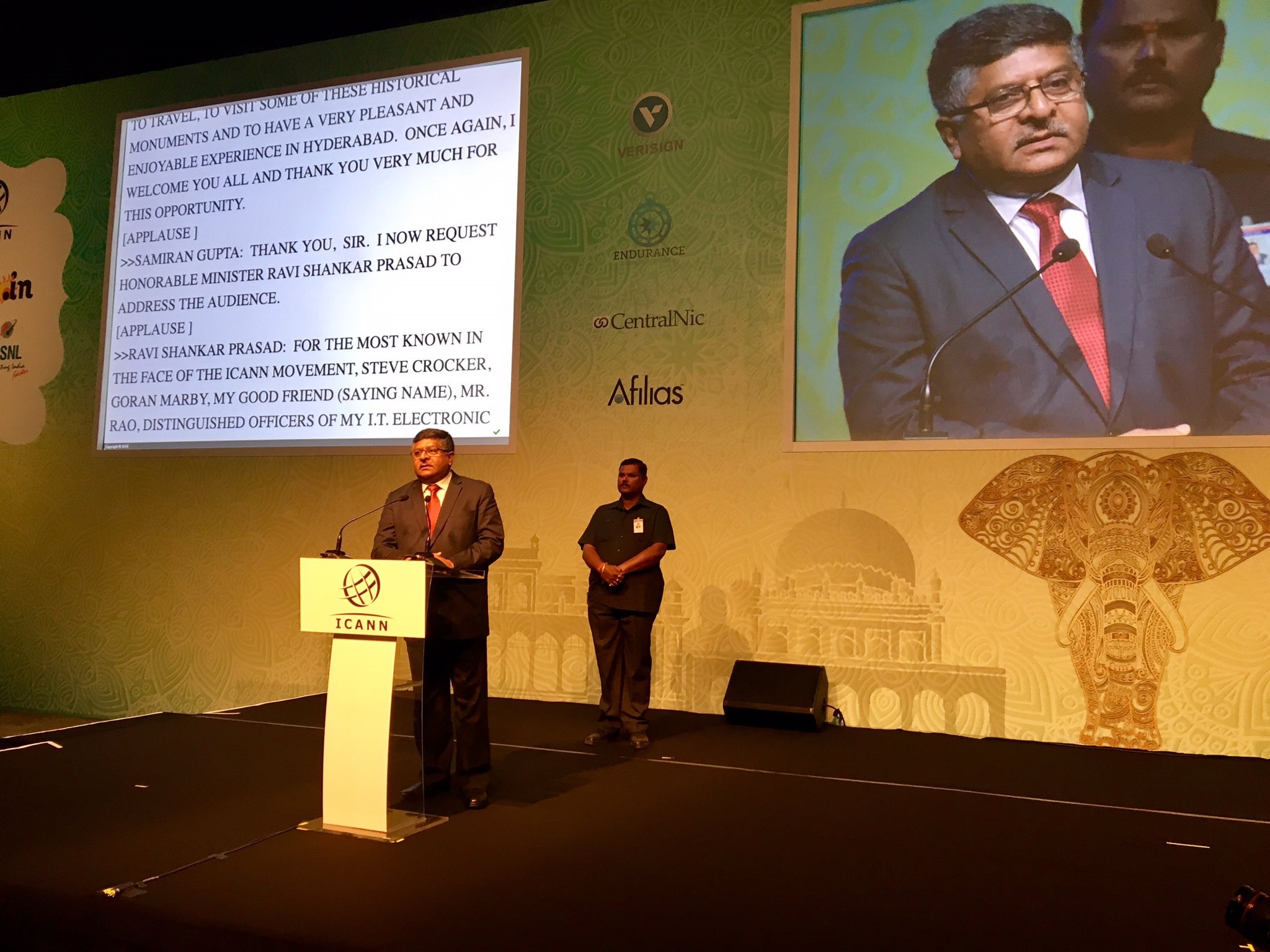 IT minister Ravi Shankar Prasad addressing the ICANN 57 meeting in Hyderabad on Saturday. Credit: Twitter