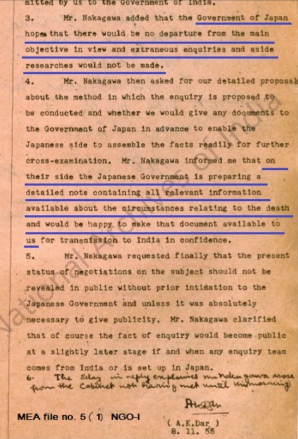 It should also be noted that Nakagawa informed simultaneously that, on their side, the Japanese government was preparing a detailed note containing all the relevant information available about the circumstances relating to Bose’s death and that it would be happy to make the document available to us for transmission to India in confidence. The confidential Japanese report was issued to the Indian government in January, 1956, prior to the setting up of the Shahnawaz Khan-led three-member Enquiry Committee in April of that year.