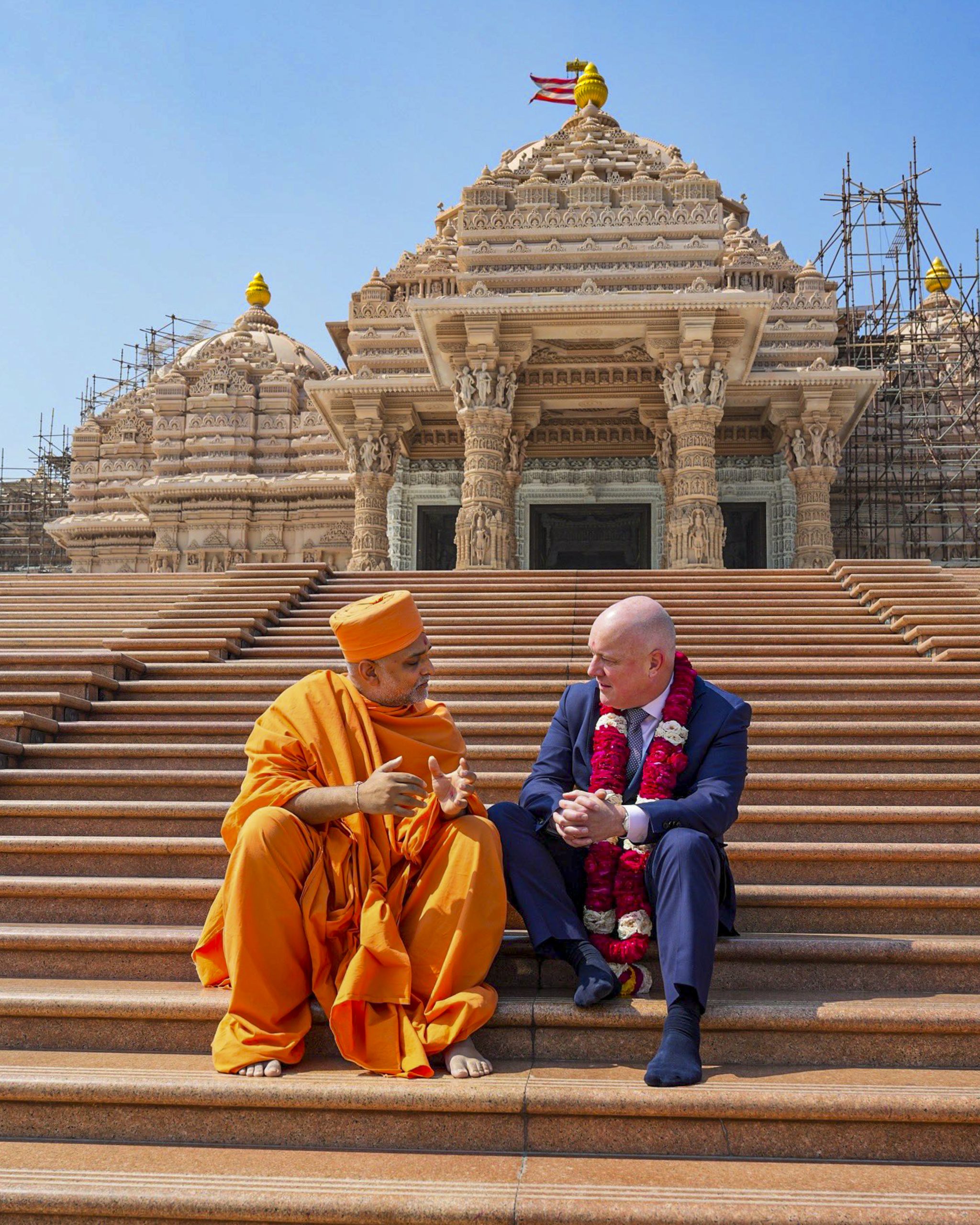 Prime Minister of New Zealand Christopher Luxon during a visit to the BAPS Swaminarayan Akshardham Temple in New Delhi on March 18, 2025. Photo: X/@chrisluxonmp