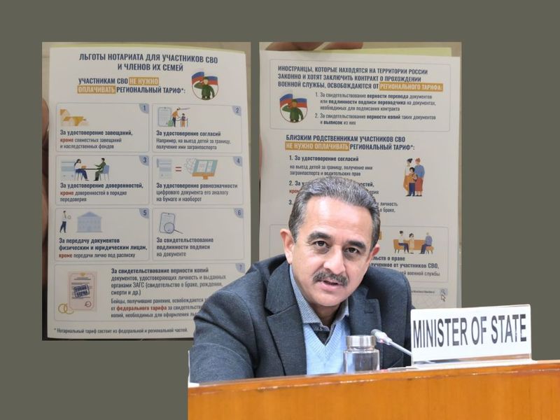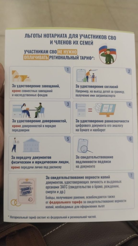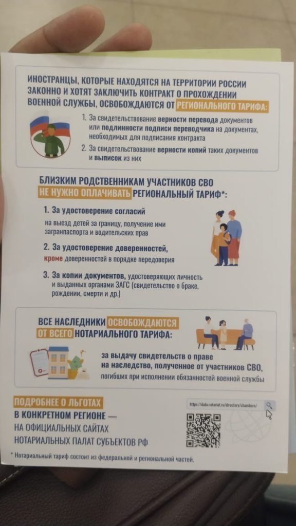 A pamphlet of the Russian Army, mentioning notary benefits for soldiers, their families and heirs. The document headline reads that foreigners who are legally in Russia and want to sign a contract with Russian Army do not need to pay regional tariff. Photo: By arrangement.