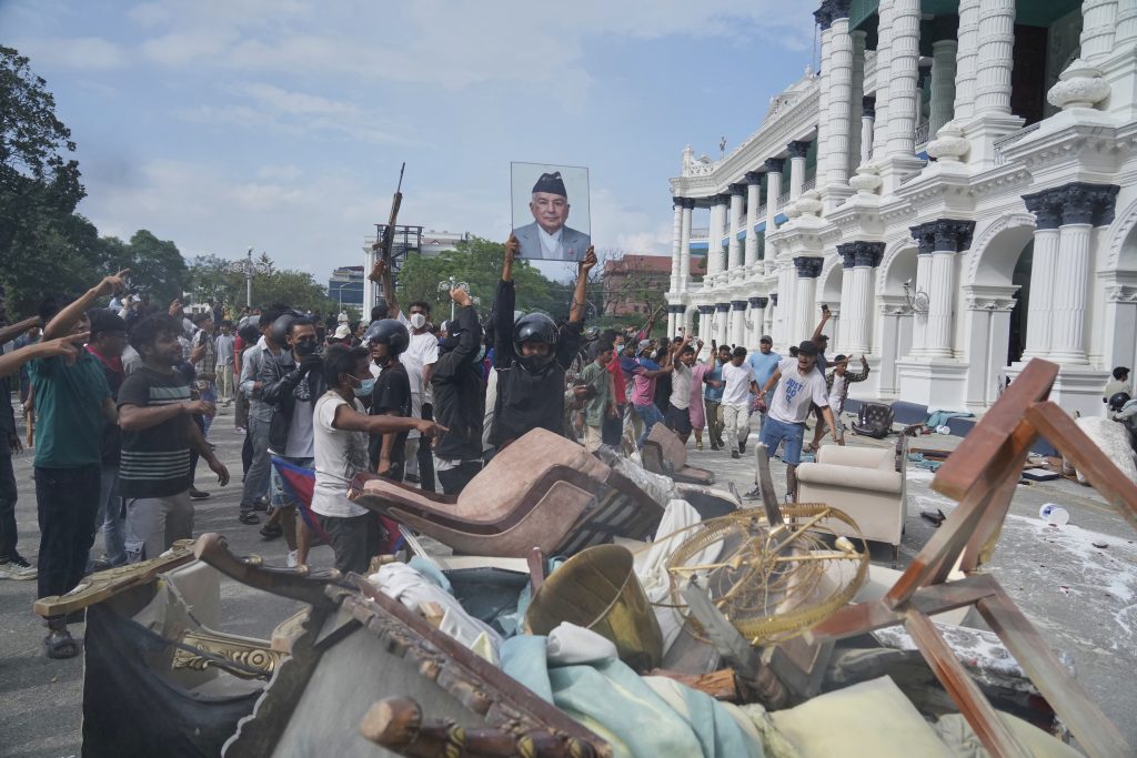 A protester throws a photograph of Nepal Prime Minister K.P. Sharma Oli outside the Singha Durbar, the seat of Nepal's government's various ministries and offices, on September 9, 2025. Photo: AP/PTI.