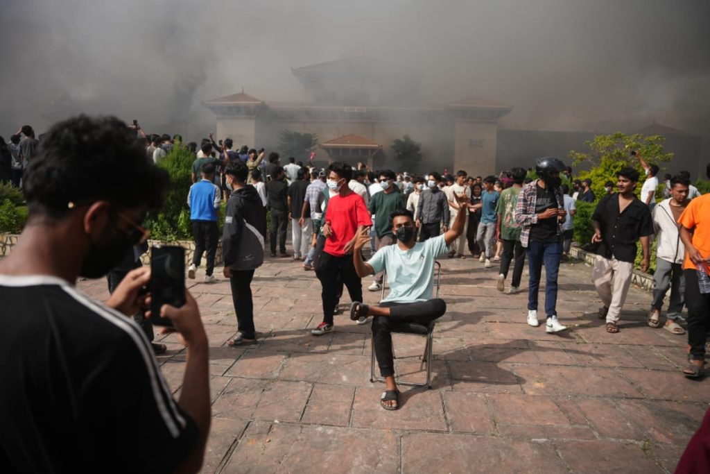 Protestors take pictures in front of the burning parliament building in Kathmandu, Nepal. Photo: AZAY HAKA/Himalkhabar