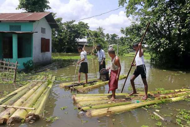 Villagers wade through a flood affected area on makeshift rafts, at Tezpur in Sonitpur district, Saturday, July 18, 2020. Photo: PTI