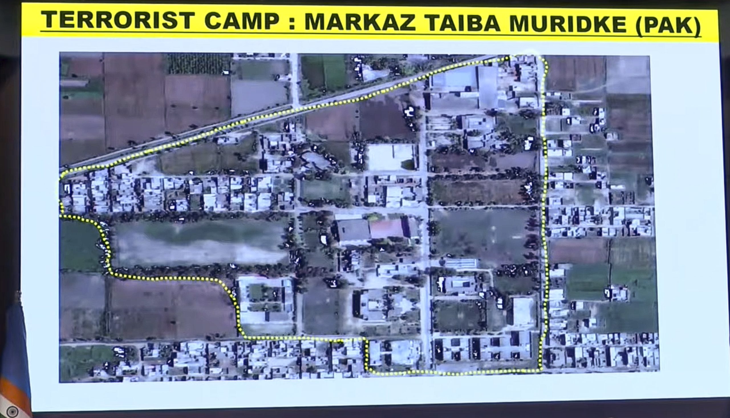 A visual of a terrorist camp in Pakistan which was struck as part of 'Operation Sindoor', being displayed during a press conference, in New Delhi. Photo: @MEAIndia/Youtube via PTI