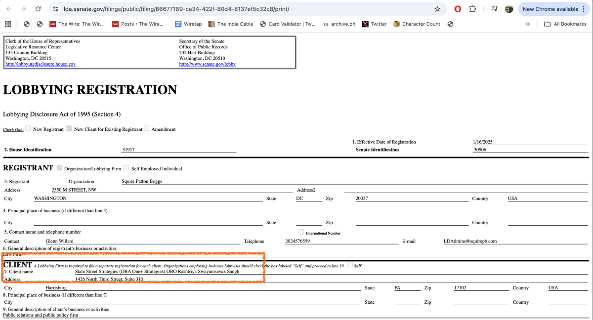 However, the RSS's denial runs thin when seen against the official filings published under the Lobbying Disclosure Act, which are available for public scrutiny.