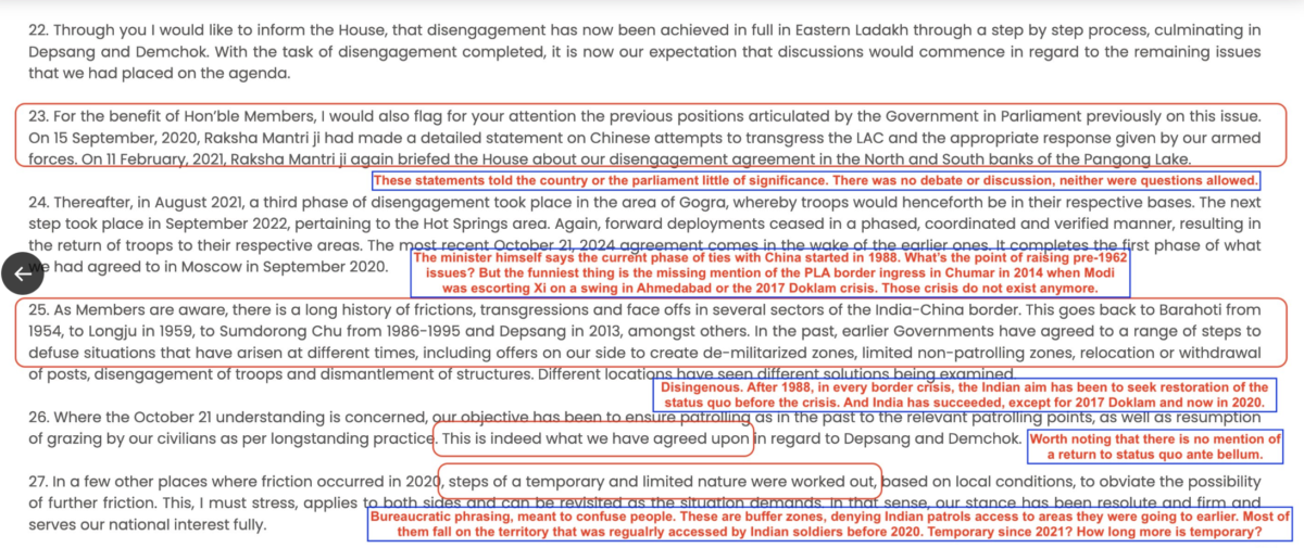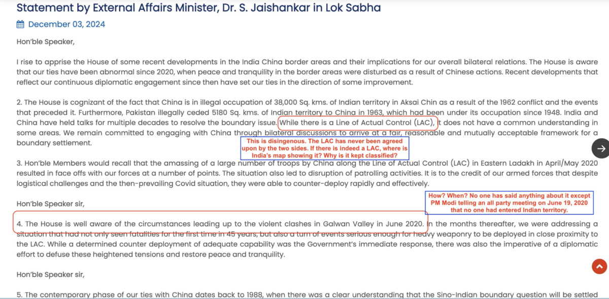 Because India's foreign minister issued a supposedly detailed statement (no discussion, debate or questions permitted) on the China border crisis, it is important to understand what he didn't say, and where he was deceptive and disingenuous. I annotated parts of his one-sided statement.