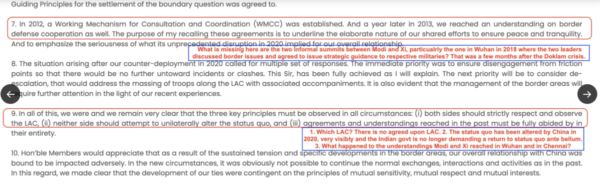 It is imperative to note that this point is misleading due to three reasons. First, which LAC? There is no agreed upon LAC. Second, the status quo has been altered by China in 2020, very visibly and the Indian government is no longer demanding a return to status quo ante bellum. Third, what happened to the understandings Modi and Xi reached in Wuhan and Chennai?