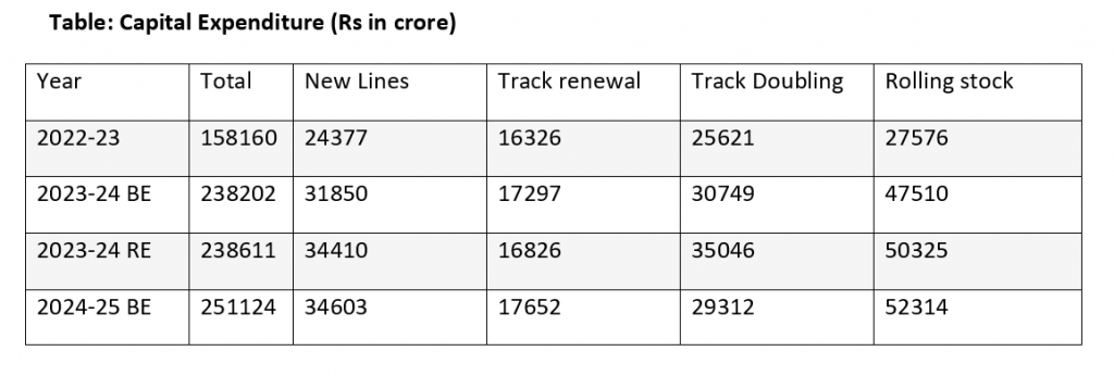 The capital outlay for the railways in 2023-24 was significantly higher than in the previous year, an increase of almost 51% over the previous year’s budgetary allocation. However, in the current fiscal year, 2024-25, the outlay has been increased to Rs 2.51 lakh crore — an increase of just about 5 per cent — not even enough to keep pace with inflation (see table).