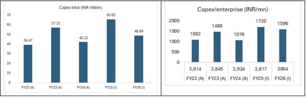 Of the lower sample of 3064 responding enterprises for FY26, only 71% or 2172 expressed capex intent. The average capex of Rs 1596 million and total capex intent of Rs 4.88 trillion in FY26 is only 5.5% CAGR over FY22 actual or approximately 1.5% in real terms, assuming average WPI inflation of 4%.