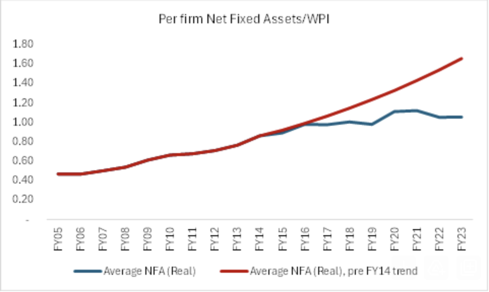 For the CMIE sample, the average net fixed capital of INR 1.61 billion grew by 6.9% 5-year CAGR and 1.2% in real terms. On a 9-year real basis, since FY14, it averaged 2.3% compared to 7.6% in FY14.