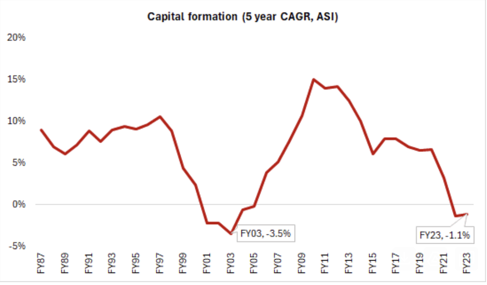 To broaden the perspective, we also assessed the compilation of private capex data from the CMIE and MOSPI’s long-term Annual Survey of Industries (ASI) available since FY74. We consider the nominal growth of net fixed assets of aggregates of domestic private companies (CMIE varying sample of 32,100 companies, FY23) and fixed capital of all industries from ASI (253 thousand firms). We derive capital formation by deflating by WPI.
