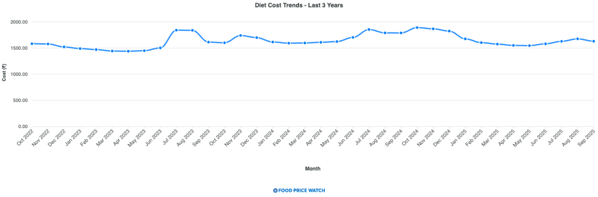 A four-person household’s grocery bill has fallen to Rs 6,519 in September 2025, a decrease of 2.7% compared to August 2025, our analysis finds.